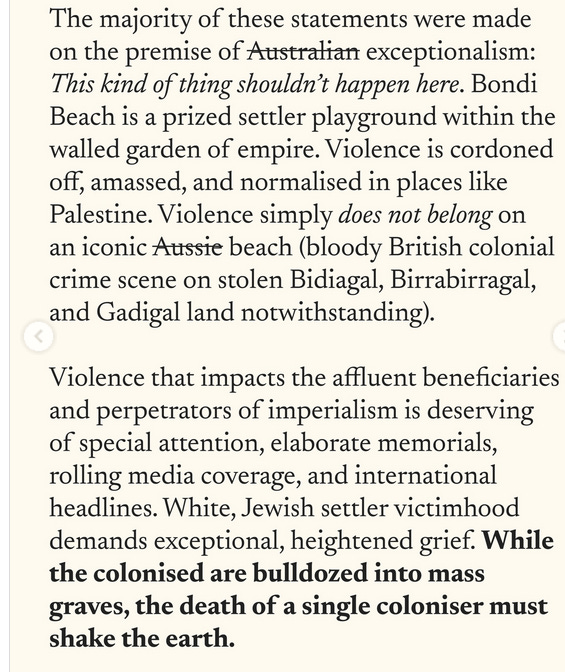 He has now come out with a vile “I spit on your graves” rift , grafted onto what are otherwise legitimate concerns about Chabad’s awful politics and government responses to the massacre here. Like a number of other masters of antisemitic propaganda, it is masked under all sorts of ideological waffle about distinguishing between Zionism and Judaism (on which he is an expert). But here he barely makes a difference between the Jews an Zionism. Jews murdered were apparently all fascist and affluent (now that’s a trope- rich Jews). “Whiteness, Jewishness, and the backdrop of Bondi Beach were enough to bestow every person killed with default innocence and virtue.”